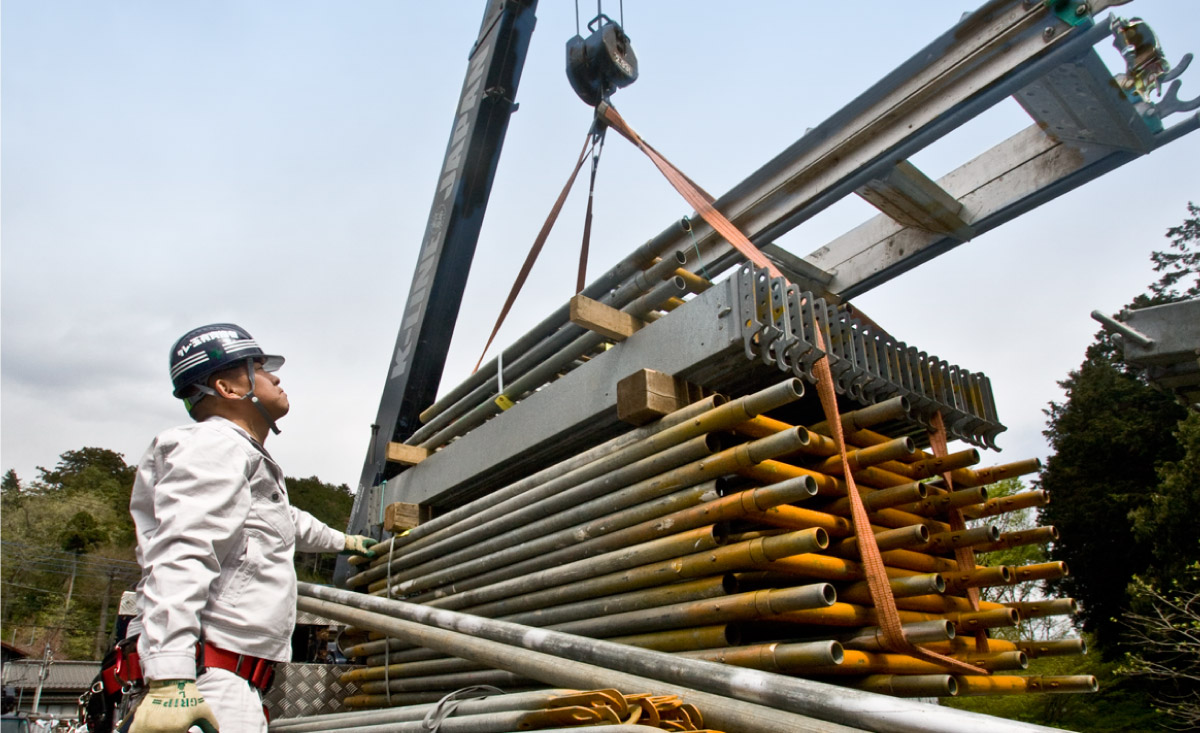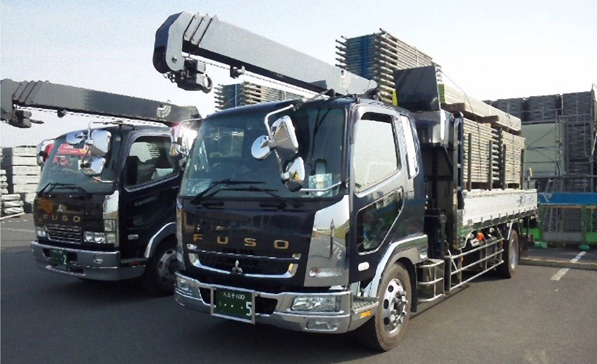私たちの仕事は建設現場で使われる足場や支柱など建設資材を専門に運搬する会社です。運搬する資材は、資材センターで現場ごとに必要な分量がまとめられたものを、フォークリフトでトラックに積み込んでもらい、現場まで運搬します。現場に到着すると、現場の指示に従い所定の箇所にユニックで荷降ろします。